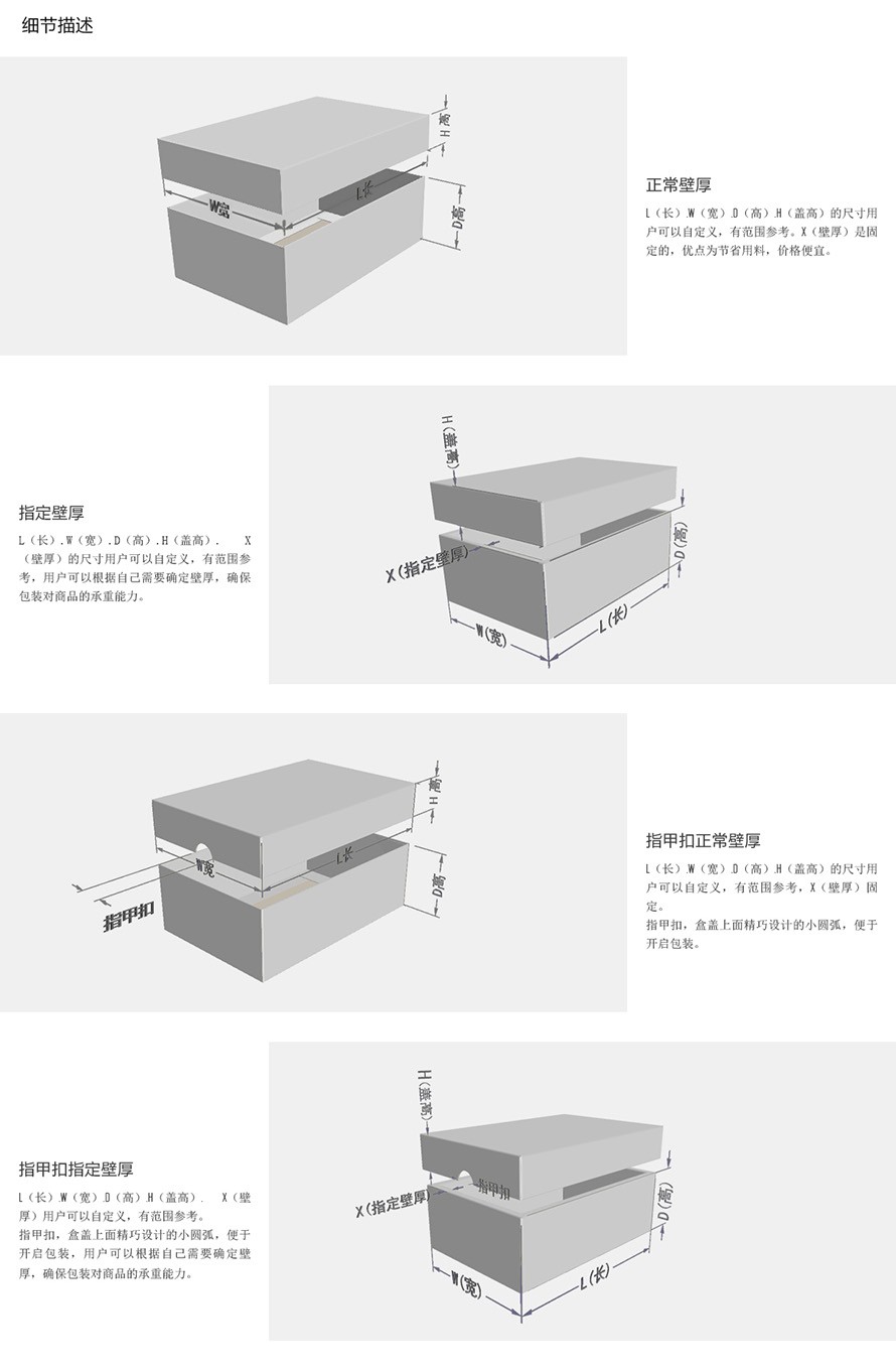 天地蓋包裝盒一般是指我們常見的普通盒子:1.上蓋蓋住部分下蓋;2.上蓋完全講下蓋蓋住,兩者高度相同。大家應該很常見,其設計簡單大方,為之多數人的選擇。